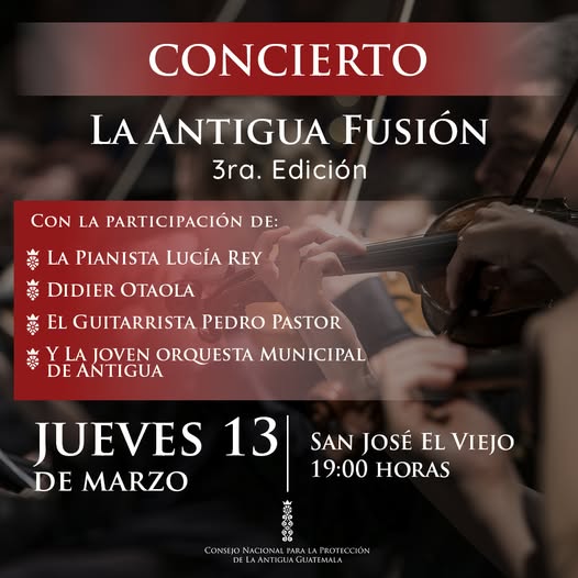 Como parte de la 3a. edición de La Antigua Fusión se tendrá el concierto con los artistas españoles Lucia Rey, Didier Otaola y Pedro Pastor, junto a la Joven Orquesta Municipal de Antigua.