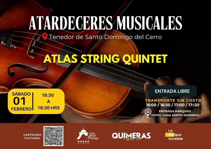 No te pierdas la presentación de: Atlas String Quintet y la fusión de un increíble atardecer en Santo Domingo del Cerro, este sábado 1 de febrero.— en Cerro Santo Domingo, Antigua Guatemala.