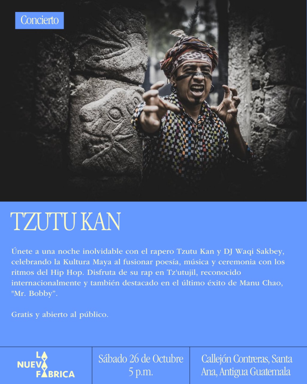 Únete a nosotros para una noche inolvidable con el rapero Tzutu Kan, el renombrado artista del Hip Hop y junto a DJ Waqi Sakbey. Esta presentación celebrará la Kultura Maya, fusionando su herencia de idioma, poesía, música y ceremonia con los poderosos ritmos del Hip Hop.